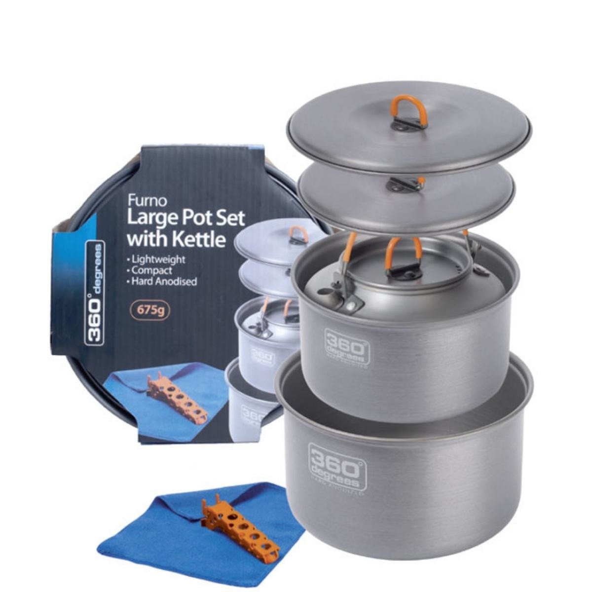 Το μεγάλο σετ κατσαρόλας Furno με βραστήρα από το 360 Degrees σας παρέχει τα αγαθά για να μαγειρέψετε και να φτιάξετε ένα ζεστό ρόφημα στην ύπαιθρο. Κατασκευασμένο από σκληρό ανοδιωμένο κράμα αλουμινίου, αυτό το σετ είναι ανθεκτικό στην τριβή και τη διάβρωση, θα κατανέμει ομοιόμορφα τη θερμότητα και, ως πρόσθετο μπόνους, είναι εύκολο να καθαριστεί. Το μεγάλο σετ κατσαρόλας Furno με βραστήρα περιέχει μια κατσαρόλα 1,7 λίτρων με καπάκι, μια κατσαρόλα 2,8 λίτρων με καπάκι, έναν βραστήρα 1 λίτρου, μια λαβή κατσαρόλας και ένα πανί πιάτων ώστε να έχετε τα απαραίτητα για να φτιάξετε ένα γεύμα. Με τη λαβή της κατσαρόλας που περιλαμβάνεται, μπορείτε να χειριστείτε αυτή την κατσαρόλα με ευκολία, ενώ το πανί πιάτων σημαίνει ότι υπάρχει ένα πράγμα λιγότερο που πρέπει να θυμάστε να έχετε μαζί σας στο ταξίδι σας. Όλα τα μέρη αυτού του σετ έχουν σχεδιαστεί για να φωλιάζουν συμπαγώς, ώστε να μπορείτε να τα αποθηκεύετε όλα στο σακίδιό σας με ευκολία. Για την επόμενη υπαίθρια περιπέτειά σας, μπορείτε να βασιστείτε στο μεγάλο σετ κατσαρόλας Furno με βραστήρα για εύκολο μαγείρεμα όταν είστε εκτός δικτύου.