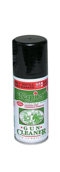 Το βραβευμένο καθαριστικό και λιπαντικό όπλου Gun Cleaner της Napier. Καθαρίζει και λιπαίνει συγχρόνως οποιοδήποτε τύπο όπλου. Αφαιρεί κατάλοιπα και καθαρίζει αποτελεσματικά χρησιμοποιώντας ασφαλείς διαλύτες αφήνοντας ταυτόχρονα μια λεπτή μεμβράνη λαδιού (VP 90) εξασφαλίζοντας διαρκή προστασία από διαβρώσεις. Δεν επηρεάζει ούτε διασπά το γράσο του όπλου και μπορεί να χρησιμοποιηθεί με ασφάλεια σε όλα τα πιστόλια και αεροβόλα όπλα. Αυτό το προϊόν έχει κατασκευαστεί ειδικά για τα όπλα και δεν καταστρέφει τα ξύλινα ή πλαστικά μέρη του όπλου.