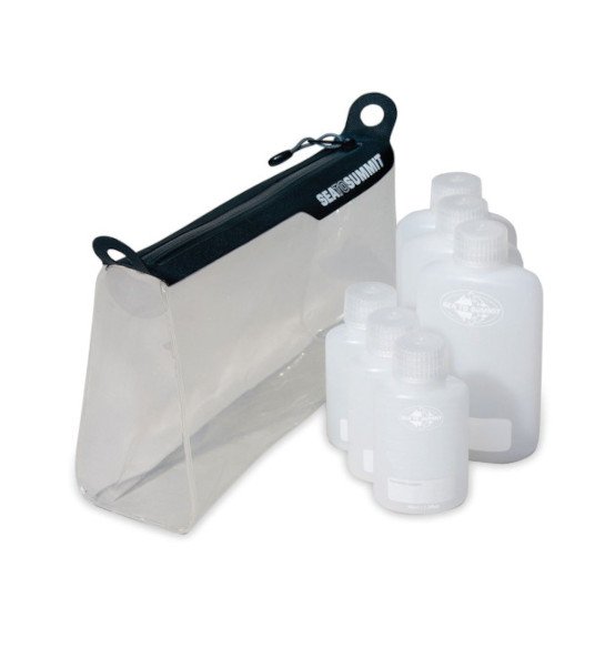 Διάφανο τσαντάκι από TPU υλικό με φερμουάρ. Περιλαμβάνει τρία μπουκάλια ανθεκτικά στη διαρροή των 89ml και 3 τρία μπουκάλια 40ml της Sea To Summit. Πληροί τις απαιτήσεις της TSA για υγρά σε αποσκευές αεροπορικής μεταφοράς.